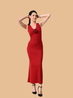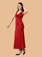 Turn heads in the striking Scarlet Bloom Evening Gown—a timeless piece designed for unforgettable moments. Crafted in a rich red hue, this sleeveless body-hugging gown features a deep V-neckline adorned with a bold 3D floral applique at the bust, adding a romantic touch. The ankle-length silhouette elongates the frame, while the smooth stretch fabric ensures comfort and elegance. Perfect for cocktail parties, formal dinners, or any special occasion where glamour is a must. Pair it with heels and statement earrings for a polished finish.