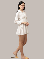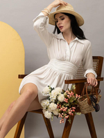Effortlessly chic and modern, the Ivory Breeze Mini Dress is a timeless wardrobe essential. Designed with a flattering collared neckline and long sleeves, this dress features a cinched waist with pleated detailing that enhances the silhouette. The flared mini skirt adds a playful touch, making it perfect for daytime outings or elegant summer evenings. Crafted in a soft ivory fabric, it's paired best with sandals or heels for a complete, polished look.