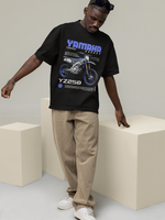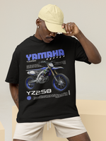 A sleek black oversized tee showcasing the iconic Yamaha YZ250 motocross bike in striking blue. Perfect for dirt bike enthusiasts and streetwear fans, this design brings the thrill of off-road racing to your wardrobe.
