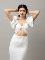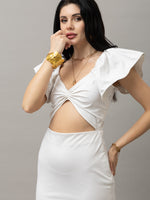 Make an unforgettable statement in our Ivory Muse Cut-Out Midi Set. This stunning co-ord features a dramatic butterfly sleeve crop top with a twisted front and center cut-out, paired with a sleek high-waisted midi skirt that hugs your curves in all the right places. Crafted in luxe stretch fabric for comfort and movement, this all-white ensemble is the perfect blend of elegance and allure—ideal for brunches, rooftop parties, or glam getaways.