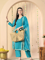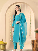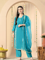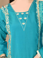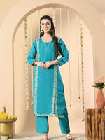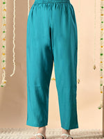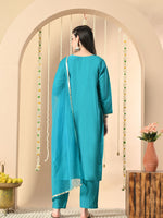 Elevate your festive wardrobe with our Turquoise Bloom Kurta Set, a perfect fusion of elegance and comfort. Crafted in a refreshing turquoise shade, this straight-cut kurta is adorned with intricate thread embroidery along the neckline...