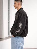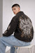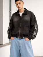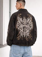 This denim jacket features durable construction, creative prints, and patchwork accents that enhance its visual appeal. Ideal for casual wear and street-inspired outfits.