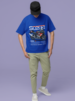 A vibrant blue oversized T-shirt showcasing the legendary Suzuki GSX-R 600. The design features a sleek bike graphic, technical details, and bold typography, capturing the essence of speed and performance. Perfect for sport bike lovers and streetwear enthusiasts alike!