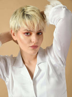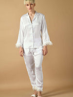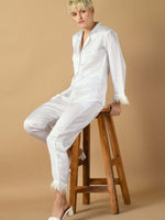The Co-ord set consists of Top and Trouser.with feather lace, top has a shirt collar neck and sleeves .