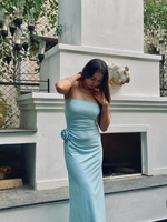 Channel soft sophistication with the Blue Belle Rosette Dress, a strapless pastel blue piece that’s all about graceful charm. Designed with a sleek silhouette and adorned with a delicate rosette detail on the waist, it...