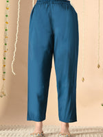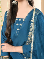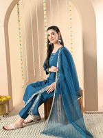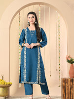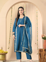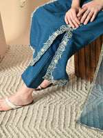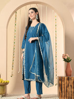 The straight-cut kurta in deep azure blue features delicate embroidered detailing along the neckline and hemline, adding a touch of understated luxury. Paired with matching slim-fit pants and a lightweight organza dupatta with embroidered borders, this ensemble embodies simplicity with a regal touch.