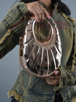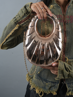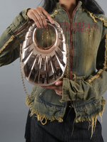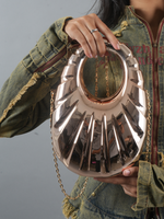 Embrace the future of fashion with the Nova Shell, a bold statement piece that merges art and elegance. Its sculpted, ripple-like design mimics the fluid curves of a seashell, cast in a high-shine metallic finish that reflects light like a cosmic wonder. The circular cut-out handle brings a modern twist, while the gold chain strap offers versatile styling—carry it by hand for a chic look or sling it crossbody for effortless glamour. Perfect for those who aren’t afraid to make waves wherever they go.