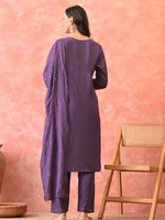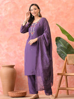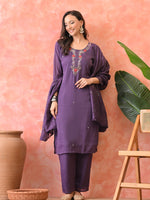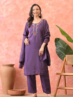 Elevate your festive style with our Royal Orchid Embroidered Kurta Set. Crafted in a regal purple shade, this three-piece ensemble features a straight-fit kurta embellished with delicate floral embroidery in pink and silver tones along the neckline and front panel. The set includes matching straight pants for a graceful silhouette and a coordinating dupatta with subtle sequin and thread work, adding a refined touch of shimmer.
