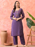 Elevate your festive style with our Royal Orchid Embroidered Kurta Set. Crafted in a regal purple shade, this three-piece ensemble features a straight-fit kurta embellished with delicate floral embroidery in pink and silver tones along...